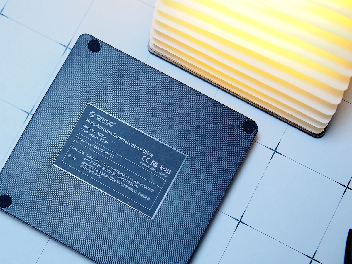 机器表面有设计了艺术感的暗花纹理,底部有产品的铭牌和四脚防滑脚垫。而主机正面只有一些DVD刻录的logo标志,没有ORICO的logo设计。