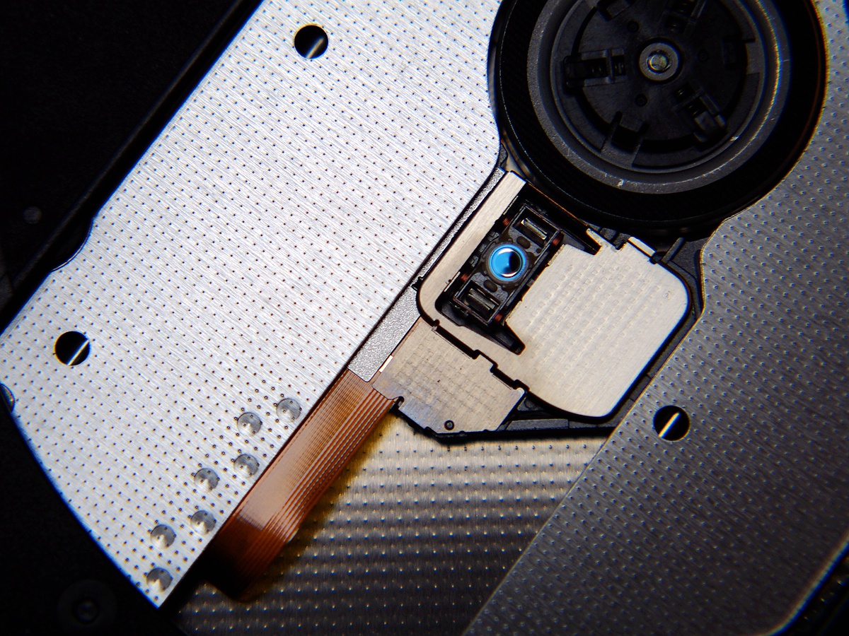 刻录机打开后,可以直接看到蓝色的激光头,这个部件是比较怕灰尘的所以一般不要随意打开,定期适当除尘。刻录机可以放入正常尺寸的光盘、迷你尺寸的光盘,可以读取一般CD和DVD也可以刻录一般的CD-R和DVD-R光盘。