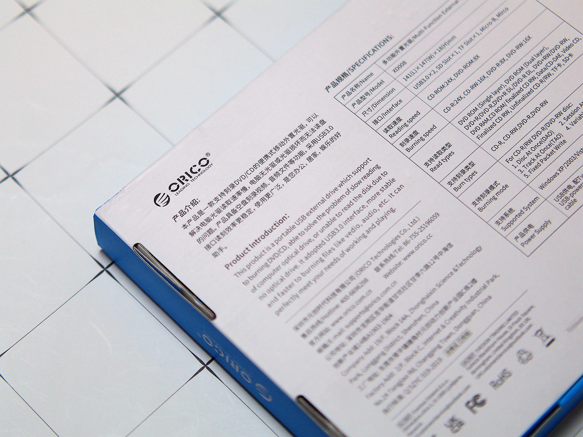 采用了ORICO一贯的蓝白风格包装,没有太多惊喜也没有太多亮点。有的只是厂家的低调和简约风格。从包装可以看出,ORICO外置刻录机支持一般DVD-RW、DVD-R、CD-RW、CDR的刻录,没有太多惊喜一样不会支持蓝光刻录。