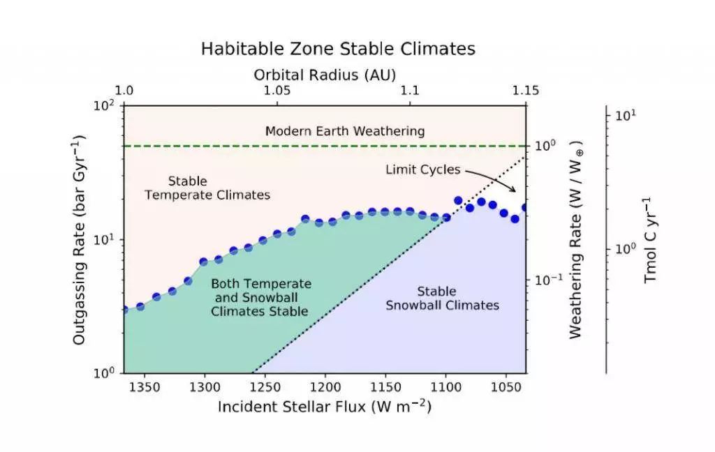 图解:该图显示了火山活动产生的二氧化碳与温带和雪球气候的降雨和侵蚀所消除的二氧化碳之间的关系。当火山活动和风化速率相互平衡时,行星会陷入雪球状态。图片来源:AGU
