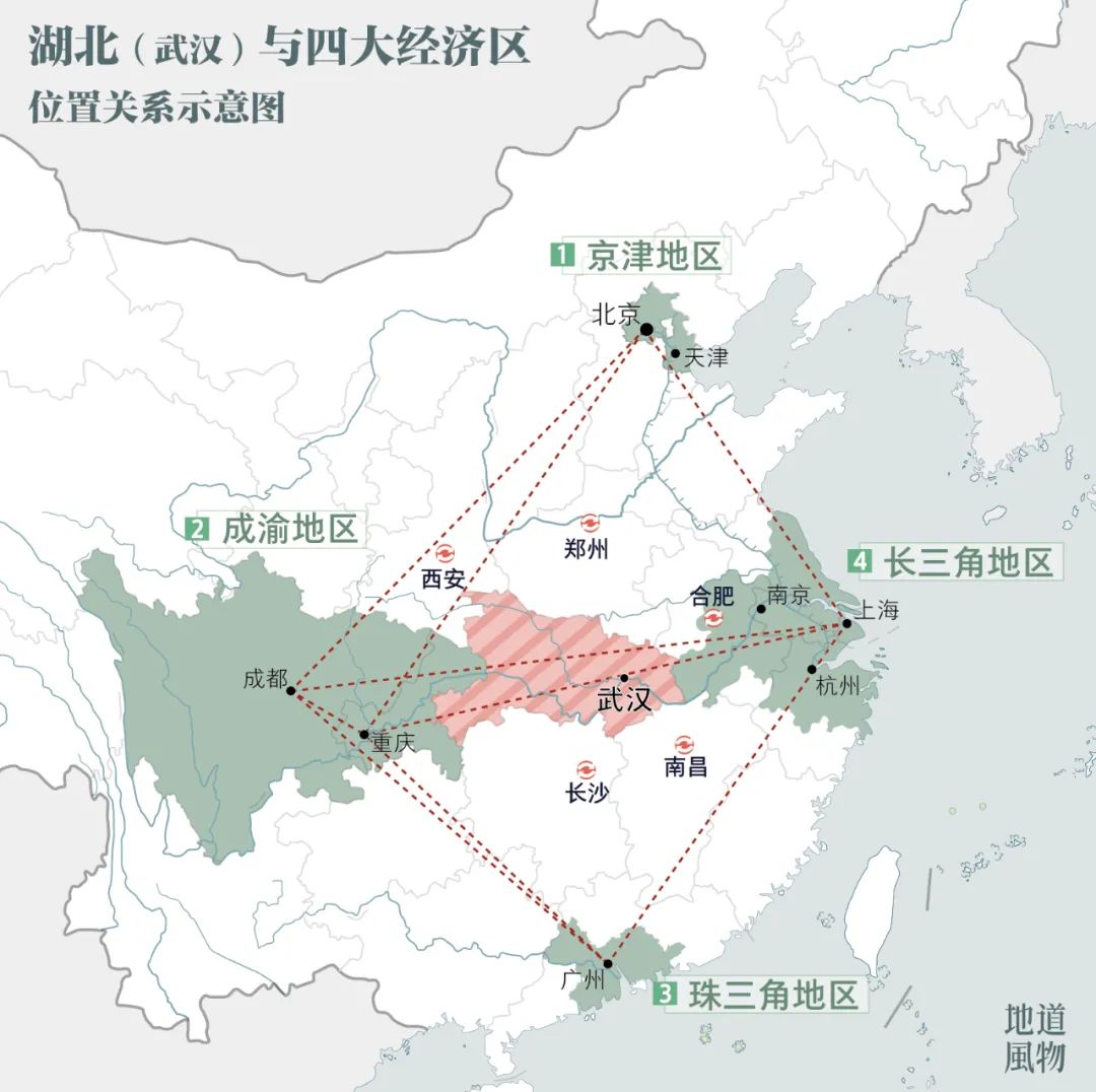 北部的京津冀、南部的珠三角、东部的长三角、西部的川渝,中国的经济“四极”在地图上组成了形似一颗闪亮的“钻石”,而这颗钻石的几何中心,恰好就是武汉为中心的湖北——钻石不光要有棱角,更要有坚实的质地——没有武汉暨湖北的支撑,这颗钻石就缺少了中枢和心脏。
