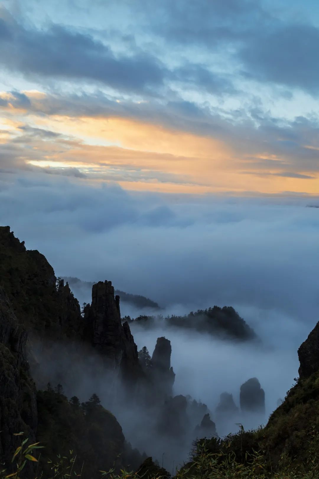 ▲ 上图,神农架群山云海。下图,俯瞰武当山紫金城,灰瓦与绿树营造道家秘境。图/视觉中国