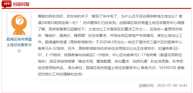 但显而易见的是,现阶段的高铁新城相当之缺人气,几乎是大部分人路过高铁站的共同感受,虽然也有如兴瓯住宅区、汇宁二组团、林桥家园、温润花苑等安置房的先后交付,更有阳光城、万科等知名房企的参与,但对于偌大的高铁新城而言,人居氛围依然过于薄弱。为此,就有关心城市建设的网友发出疑问,并得到瓯海区政府房屋土地征收服务中心的答复,如潘桥单元E-07、E-10地块、铁路新客站站前区C-10地块、中心区站前单元C-17地块(豪盛花苑附近地块)等住宅用地正在谋划出让。