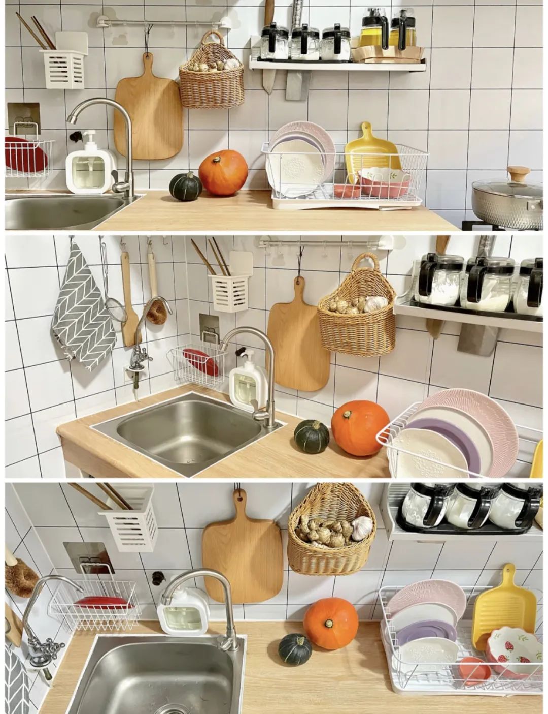 调味料、碗筷、清洁用品等都可以利用一些墙面收纳好物去做归整,类似的之前也提过很多,这里就不再多说啦,感兴趣的朋友可以看一下之前发布过厨房收纳的文章→“二八”原则超实用收纳法——厨房篇。