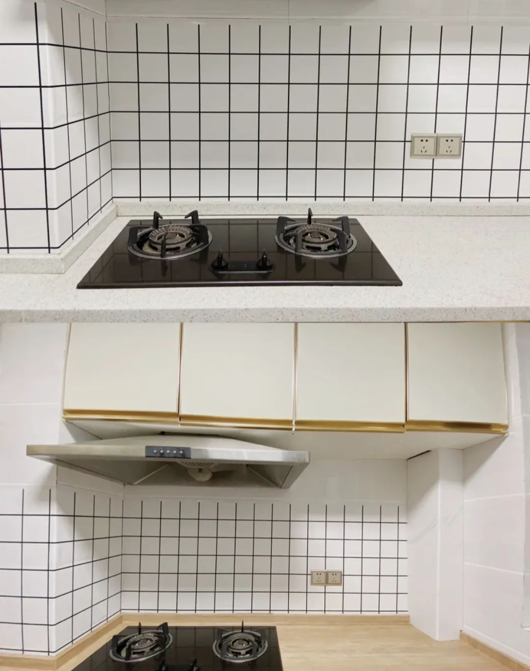 如果是台面墙体也需要改造,最低成本且易操作的就是利用贴纸;灶台台面使用率很高,有时候放东西容易磕碰,必须选择厚一点、耐用性高一点的贴纸,且需要购买防水、防油、防火的材料;墙面的话,如果不是特别想改造,不建议整墙都贴,只需要在油烟机灶台那一面贴上防水防油的贴纸就可以了。