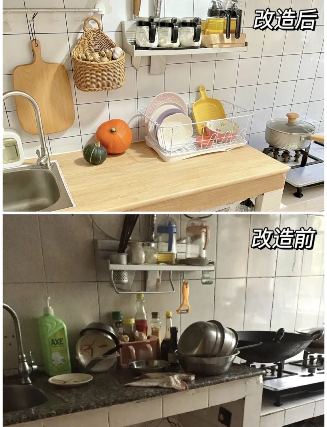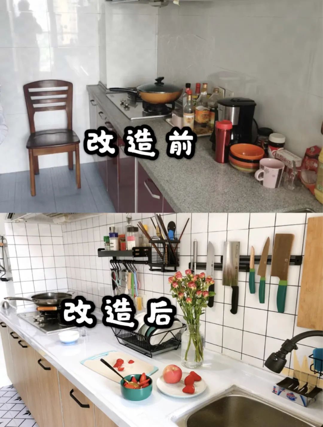 通过对比图大家能很直观的感受到厨房改造的好处,不仅视觉上美观,显得整洁,更是解决了后续一些清洁麻烦的问题,让人喜欢上做饭,体会到做菜的乐趣。