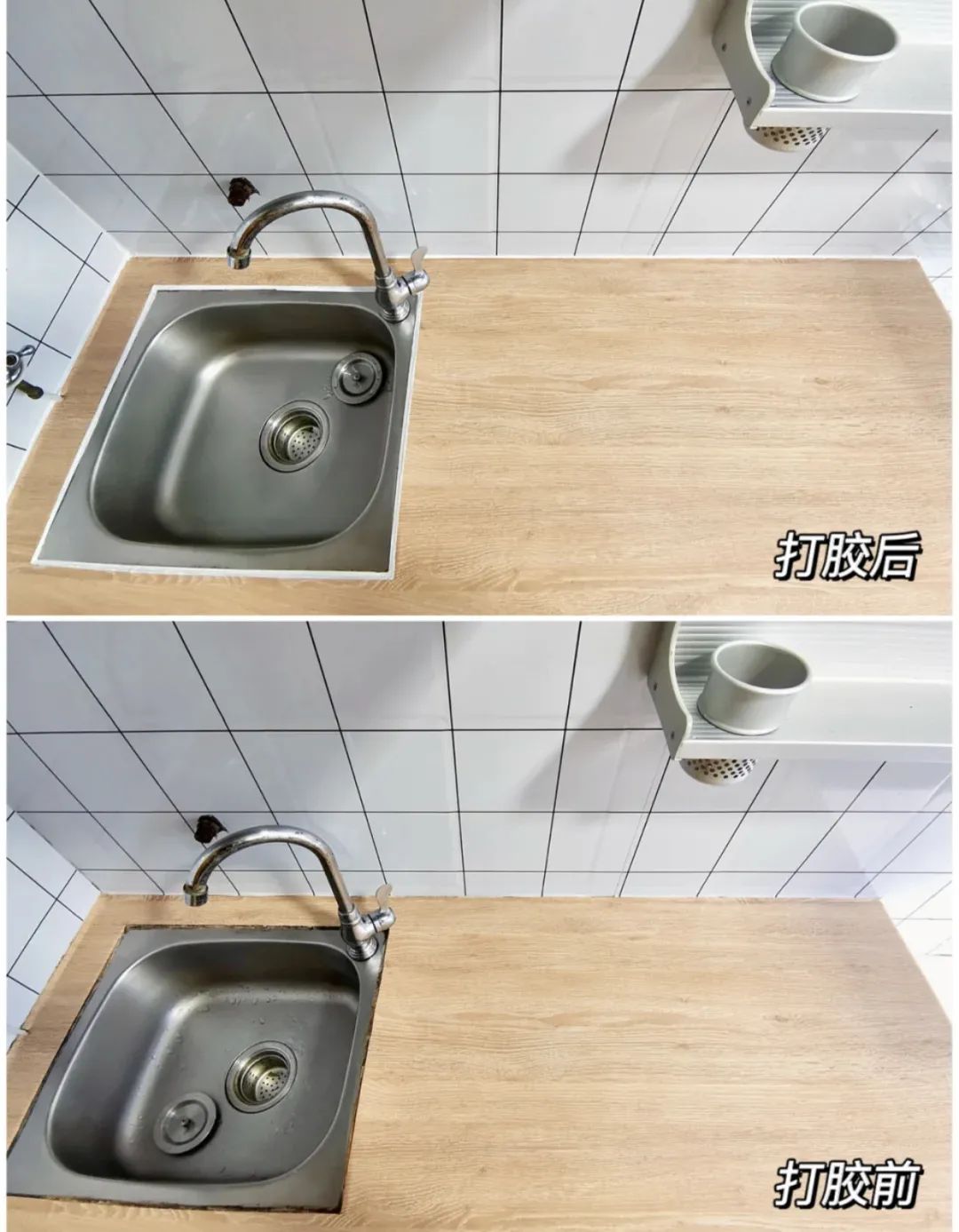 厨房因为有很多水,而贴纸毕竟还是纸,墙、台和纸之间的缝隙如果不做防水,非常容易翘边、发霉或渗水,所以一定要做贴纸的封边,最好的方法就是使用玻璃防霉胶,它不仅能起到美观作用,还能防水防霉,而且适用于很多场景,比如转角处,90度角衔接处等。