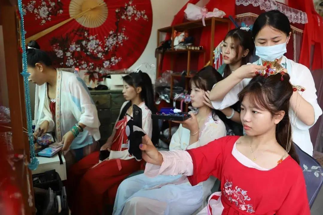 汉朝的桃心唇、盛唐的鸳鸯眉、宋朝的珍珠面、明朝的酒晕妆,化妆师根据所选服装,进行妆容描绘与发型打造。