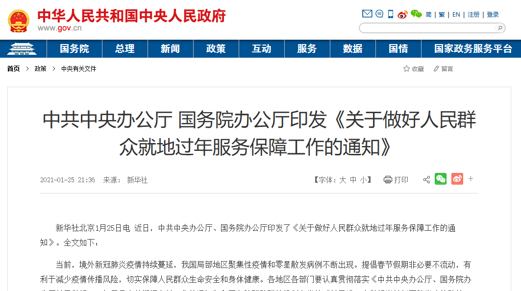 继29省份倡议“就地过年”后,中共中央办公厅、国务院办公厅印发《关于做好人民群众就地过年服务保障工作的通知》,《通知》要求合理有序引导务工人员春节期间安心留在工作地,以下是主要内容: