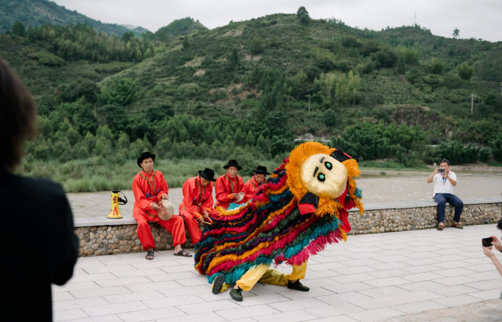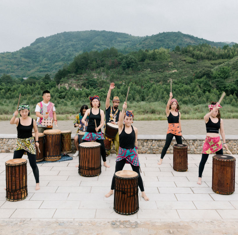 开幕式上,从日本回国、玩非洲鼓的青年艺术家KIKI带着他们“木木之家”西非音乐工作室的伙伴、朋友,与当地老艺人合作,重新演绎传统的纸狮。