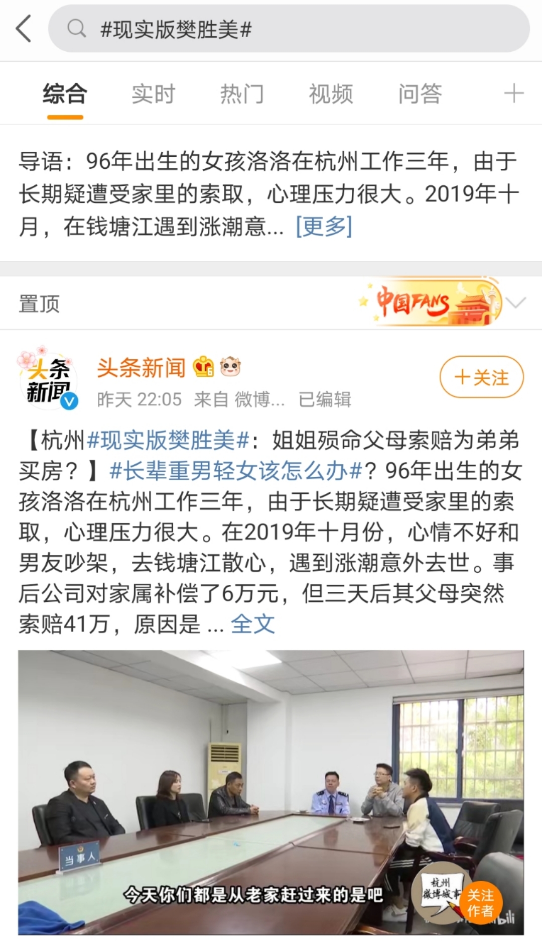 1 月 24 日,《杭州和事佬》节目最新一期播出后,一位 24 岁女生的不幸遭遇和其原生家庭的冷漠令不少网友直呼,简直就是 " 现实版樊胜美 ",而其父母在女儿意外遇难后要求公司赔偿 41 万,竟是为了给儿子买房攒首付的说辞,更是引发了网友的集体谴责。