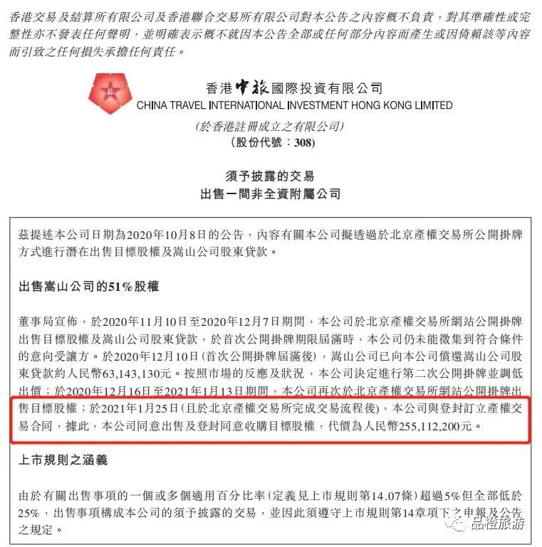 据香港中旅披露:2020年11月10日至12月7日,香港中旅首次在北交所公开挂牌出售嵩山少林及其股东贷款,转让价格约为人民币3.47亿元,其中嵩山少林51%股权作价约为人民币2.83亿元,但未能征集到符合条件的意向受让方;12月10日,嵩山少林向香港中旅偿还其股东贷款约人民币6314.31万元,因此在2020年12月16日至2021年1月13日,嵩山少林第二次挂牌转让时,价格有所下降,公开转让价为人民币2.55亿元(为目标股权估值的90%)。