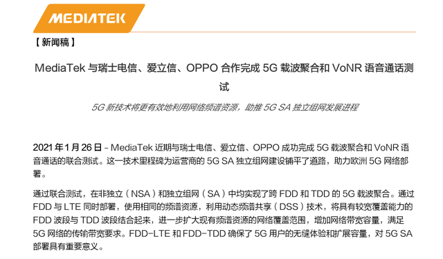 (联发科与瑞士电信、爱立信、OPPO 合作完成 5G 载波聚合和 VoNR 语音通话联合测试)