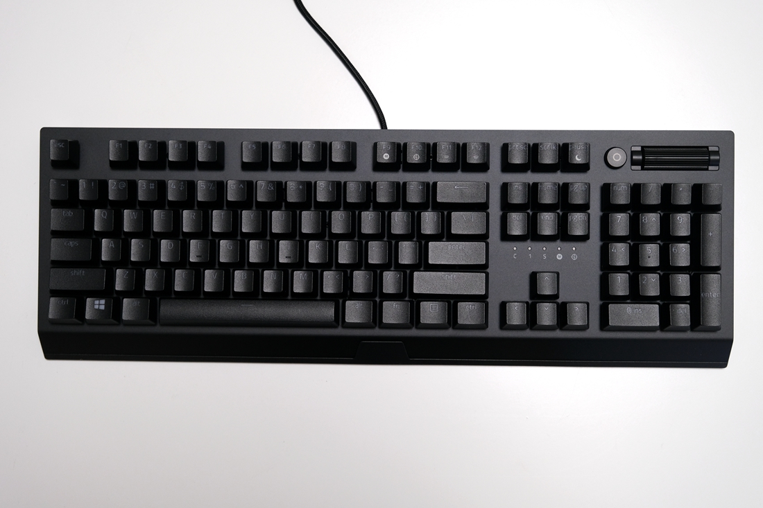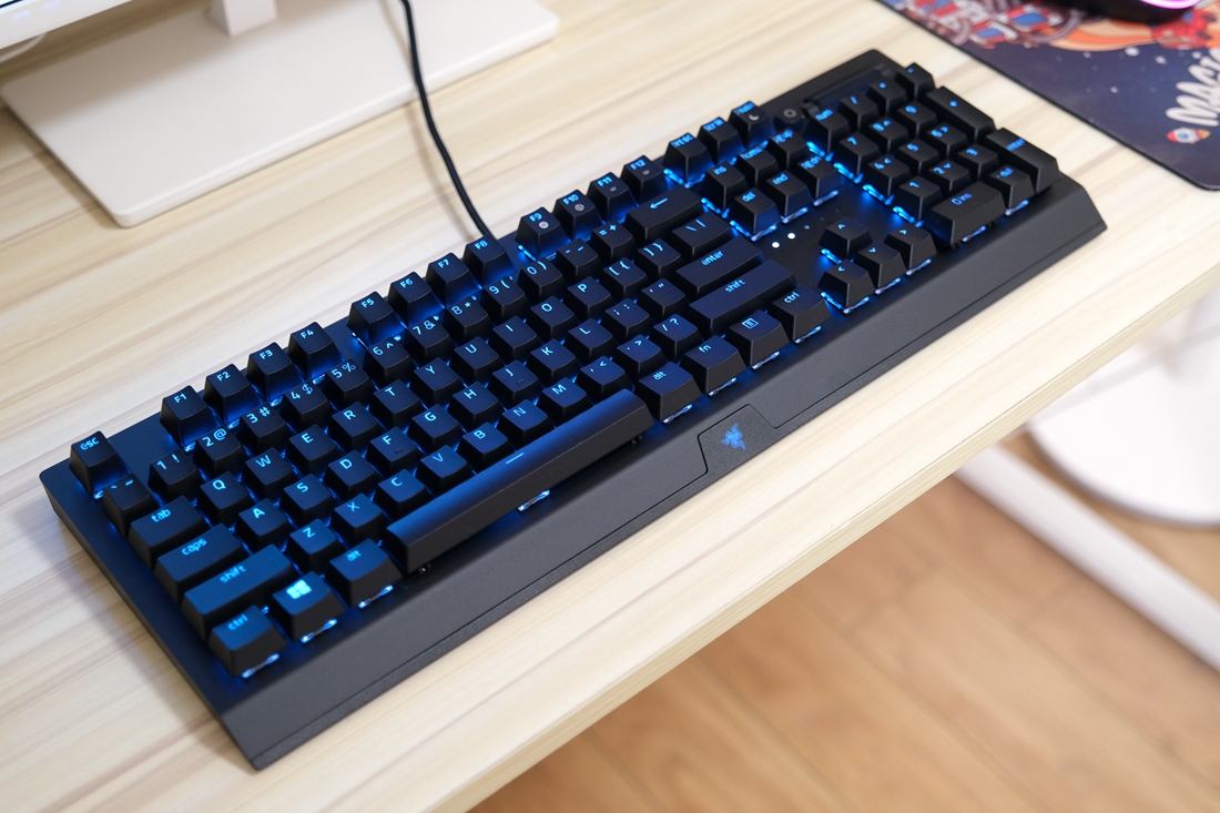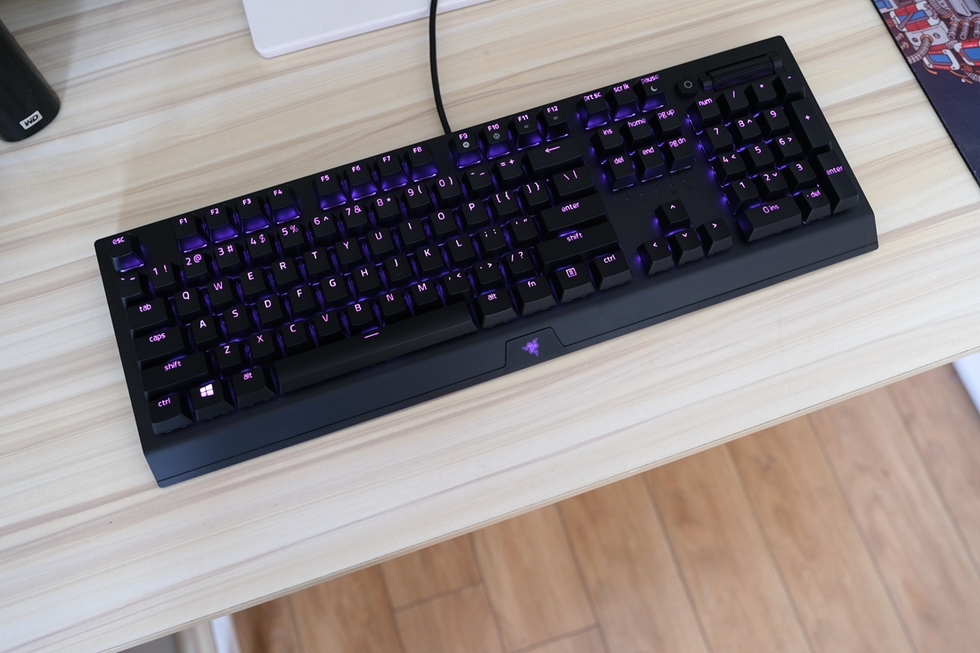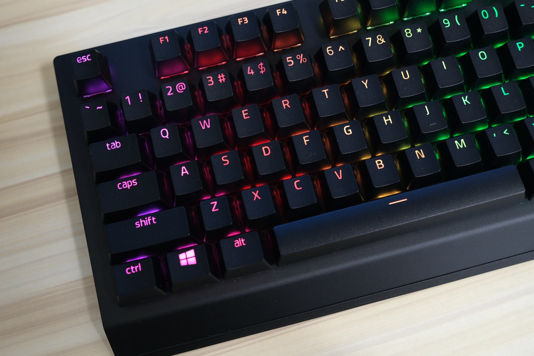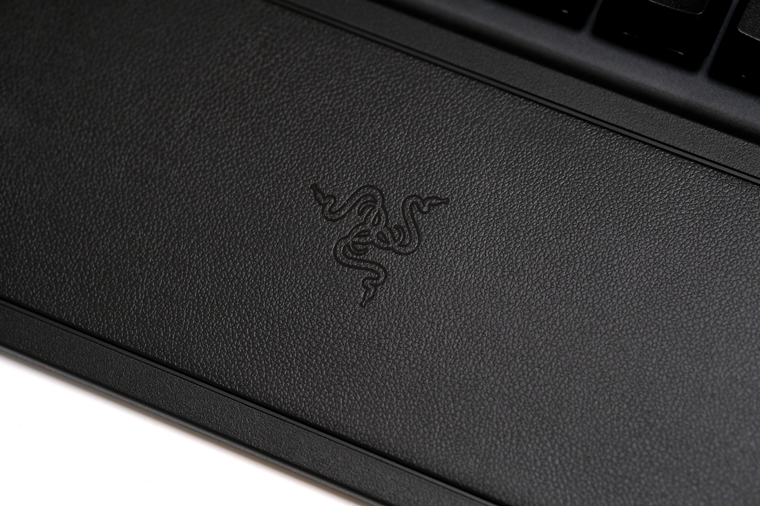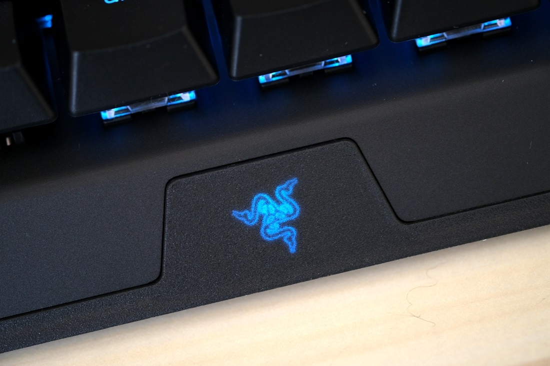 在键盘的下侧边框中间还设有一个雷蛇的LOGO,它作为顶部面板和底部面板的中框,所使用的材质和与工艺与键帽差不多,只是防油涂层改为磨砂工艺,同时带有指示灯,当键盘的背光亮起,这个LOGO也会跟着亮起,如果是选择波浪灯效,那么LOGO的指示灯也会跟着变色,很是吸睛。