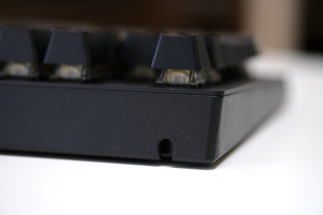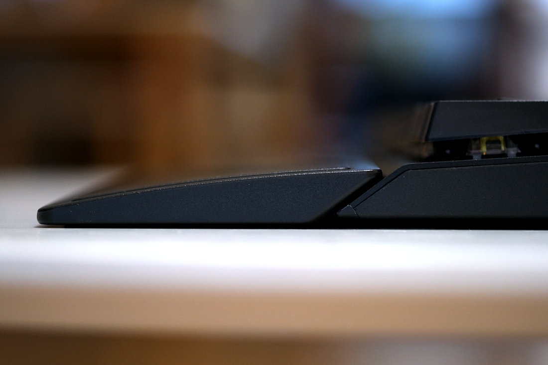 从侧面看,黑寡妇蜘蛛V3的键帽排列是呈阶梯式的,上下两侧的键帽相对高一些,让键帽的输入角度形成一个合理的弧线高度,手指一抬一落更容易敲击键盘上面两行按键,舒适感提升了不少。