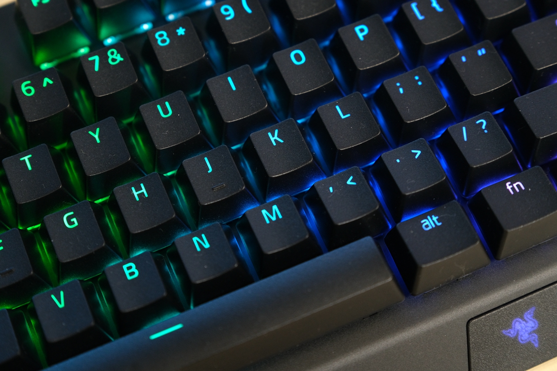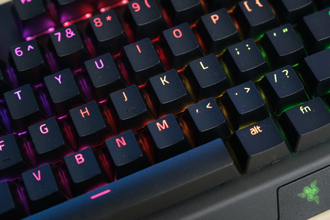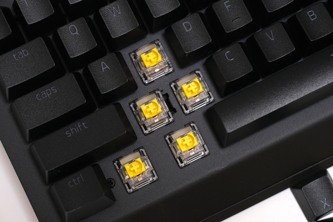 雷蛇的机械键盘都是使用自己研发的轴体,这次黑寡妇蜘蛛V3采用的轴体有绿轴和黄轴两种版本,笔者体验的是黄轴款,取下键帽便可以看到轴体了。它的总行程为3.5mm,触发键程为1.2mm,触发点与重置点间距为0mm,触发压力为45g,相对比较静音,点击寿命为8000万次,直上直下无段落的按压手感可以让玩家在游戏中有更加迅速的操控体验。与上一代黄轴相比,这代黄轴增强了静音效果。如果喜欢更爽快一些的按键手感,可以考虑绿轴,因为它的段落感明显,有清脆的按键声。