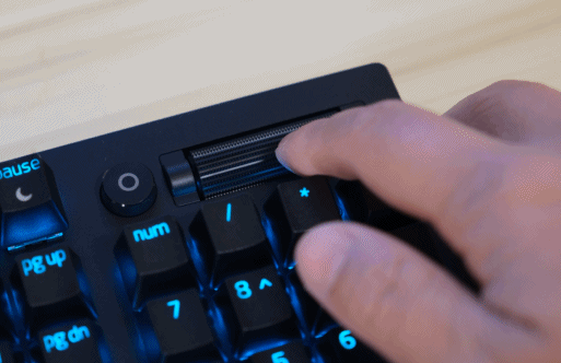 这两个媒体键主要用于音乐播放操控,如暂停、播放、切换歌曲,滚轮键则用于音量大小调整,如果通过雷云3驱动程序,还可以配置成亮度的调节。当然了,笔者更偏好用它来调整音量,日常使用中实在是方便极了。
