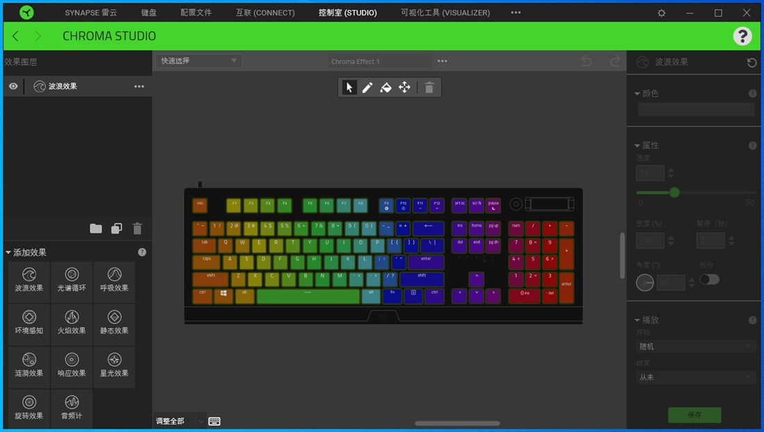 黑寡妇蜘蛛V3默认的灯效为光谱循环,除此之外还提供了波浪、呼吸、环境感知、火焰、星光、音频计等共11种不同灯效模式,最高可显示出1670万种颜色,营造出一种流光溢彩、十分酷炫的走灯效果,其中笔者最偏好的波浪效果。通过雷云3驱动程序,还可以对灯光的亮度、走灯速度和颜色变换时间等参数进行自定义,具有一定的可玩性。