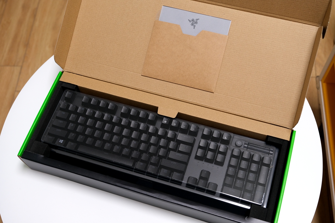 打开包装盒,键盘使用透明塑料壳和海绵模具做了加固保护,线材则用纸皮隔开收纳,厂家在细节之后还是挺走心的。