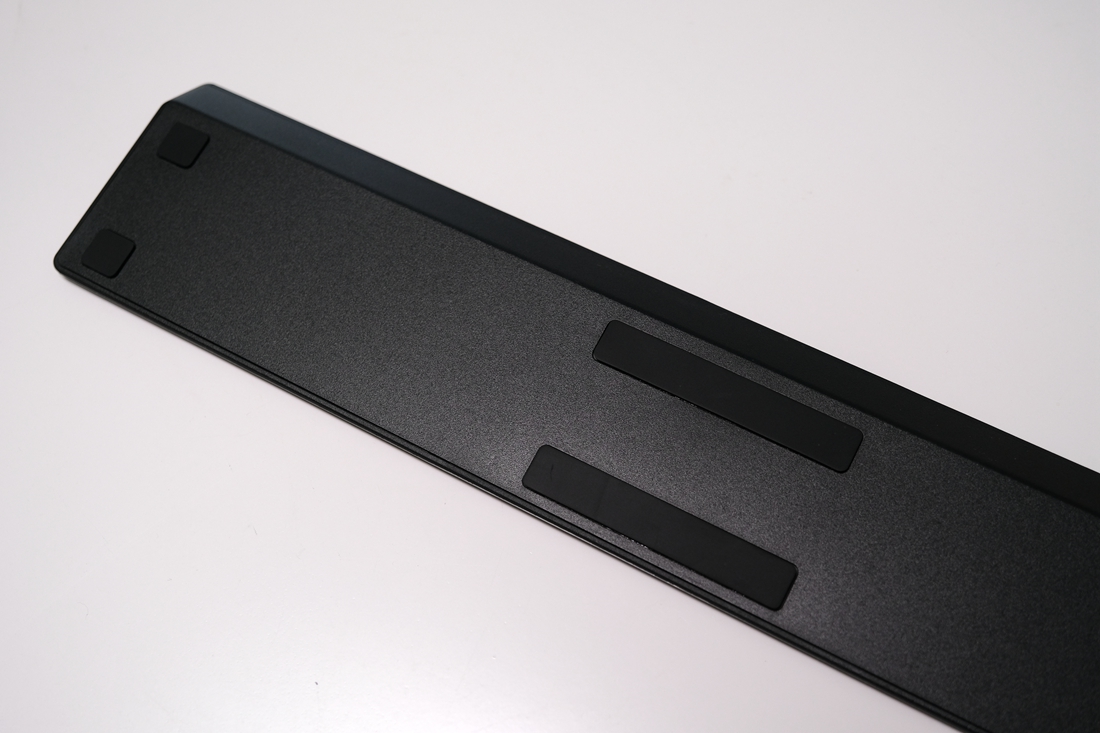 键盘的背面外壳也是采用塑料材质,并做了磨砂工艺处理,防划防尘效果也不错,中间贴有产品的铭牌信息标签,四个边角各设有一个硅胶脚垫,可以让键盘在放置时更加稳固,不易滑动。