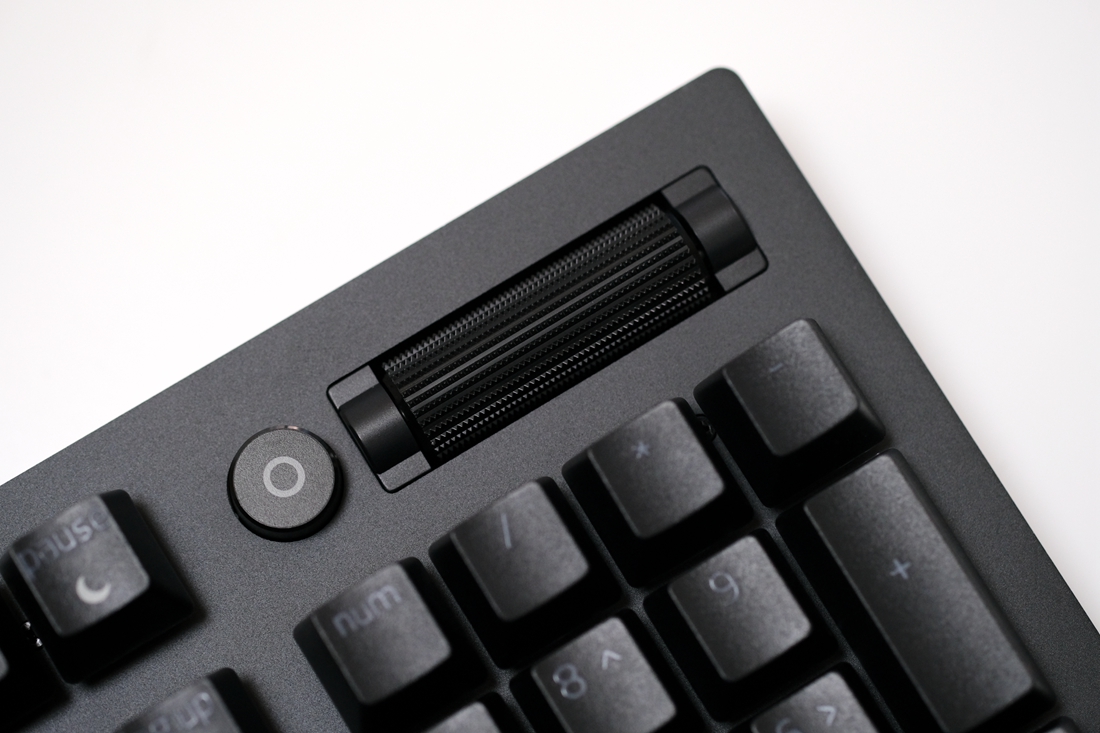 滚轮键宽度较大,键帽表面有密集的凸点,类似硅胶材质,触感极佳,调节时的阻尼感适中。值得一提的是,滚轮键还可以向下单击,实现一键静音的操作。