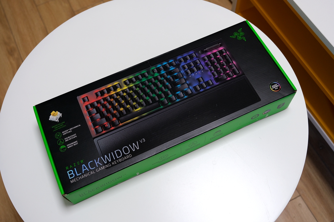 直言不讳,虽然雷蛇这个名字如雷贯耳,但黑寡妇蜘蛛V3却是笔者接触到的该品牌的第一款产品。它的产品包装就给我不错的第一印象,黑绿是雷蛇产品的经典配色,包装盒也同样采用了这两种颜色,正面印有键盘的渲染图,左上角是黄轴轴体的介绍,右上角则是品牌LOGO,给人一种霸气四溢的感觉。