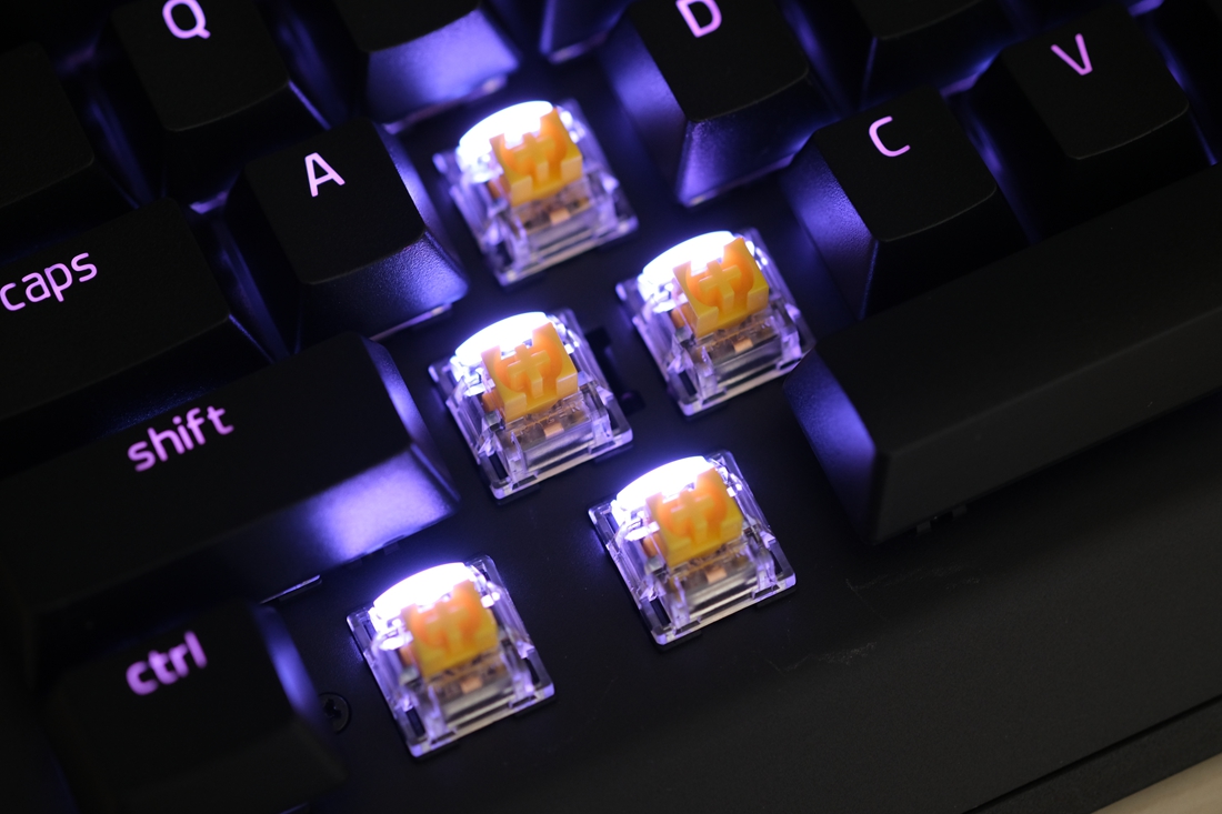 黑寡妇蜘蛛V3并非笔者使用的第一款机械键盘,但它采用的黄轴轴体却是首次接触,和其他轴体相比较,首先最大使用感受是手感比较舒适,长时间的敲击,手也不会觉得酸疼,因为它的触发键程只有1.2mm,触发压力仅为45克,所以轻敲就能给予迅速反馈,虽然它不像绿轴有明显的段落感,但是对于几乎每天都要大量码字的人来说,选择黄轴也是可以很好地胜任。