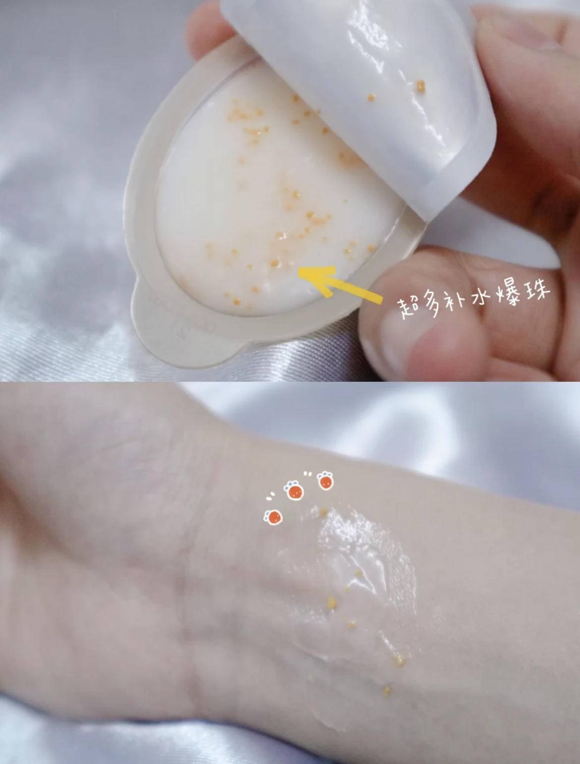 撕开发膜,可以看见丰富的黄色爆水珠珠,而且一触即溶,瞬间补水。小小一颗出门携带也很方便哦~