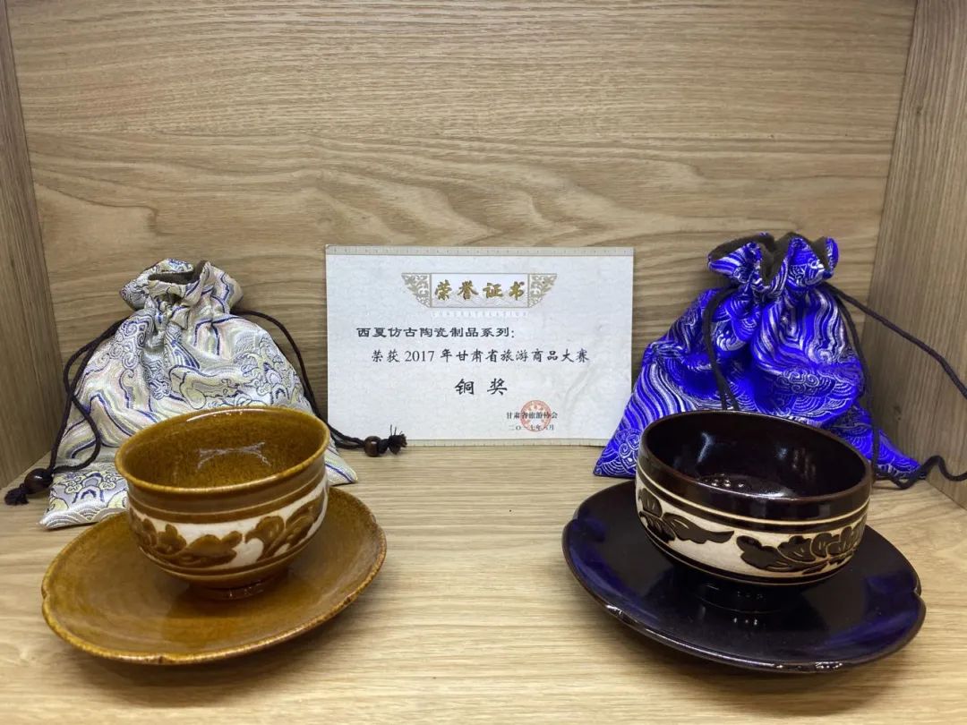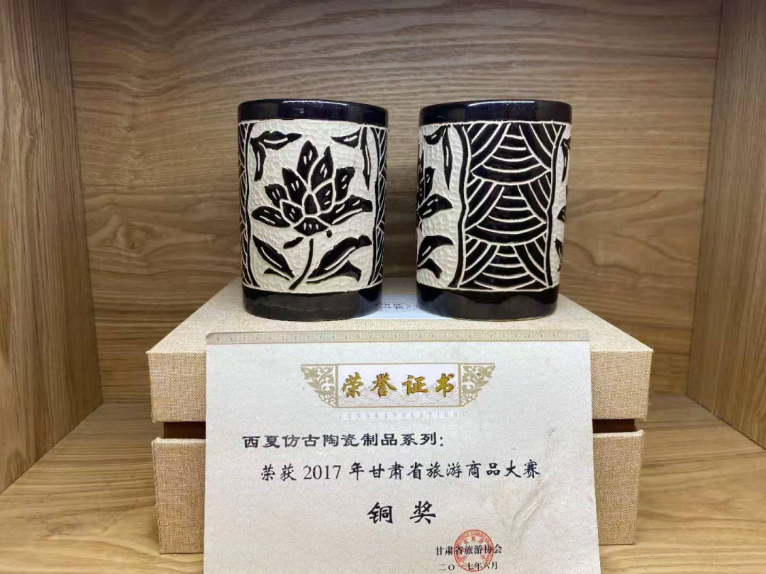 你想拥有一件西夏手工瓷器吗?武博满足你!我馆剔刻花陶瓷系列文创,设计灵感正是取材于西夏独特的剔刻花制瓷技艺。将西夏剔刻花瓷器常用纹样和特殊器型相融合,采用手工剔刻,设计出适合现代生活使用的酒具、茶具、文具等产品,深受游客的喜爱,该系列文创荣获了甘肃省旅游商品大赛铜奖。