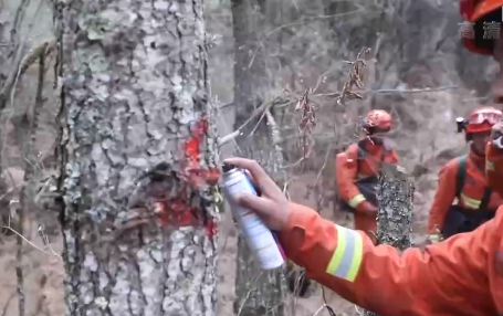 西藏森林消防总队吉隆驻防分队分队长 洛桑旺久:像我这样进入林子以后,然后每隔20米左右,你们要用就是用漆也可以,如果实在没有漆,你们拿身上的一些布料或者我们利用砍刀在树上做个标记。