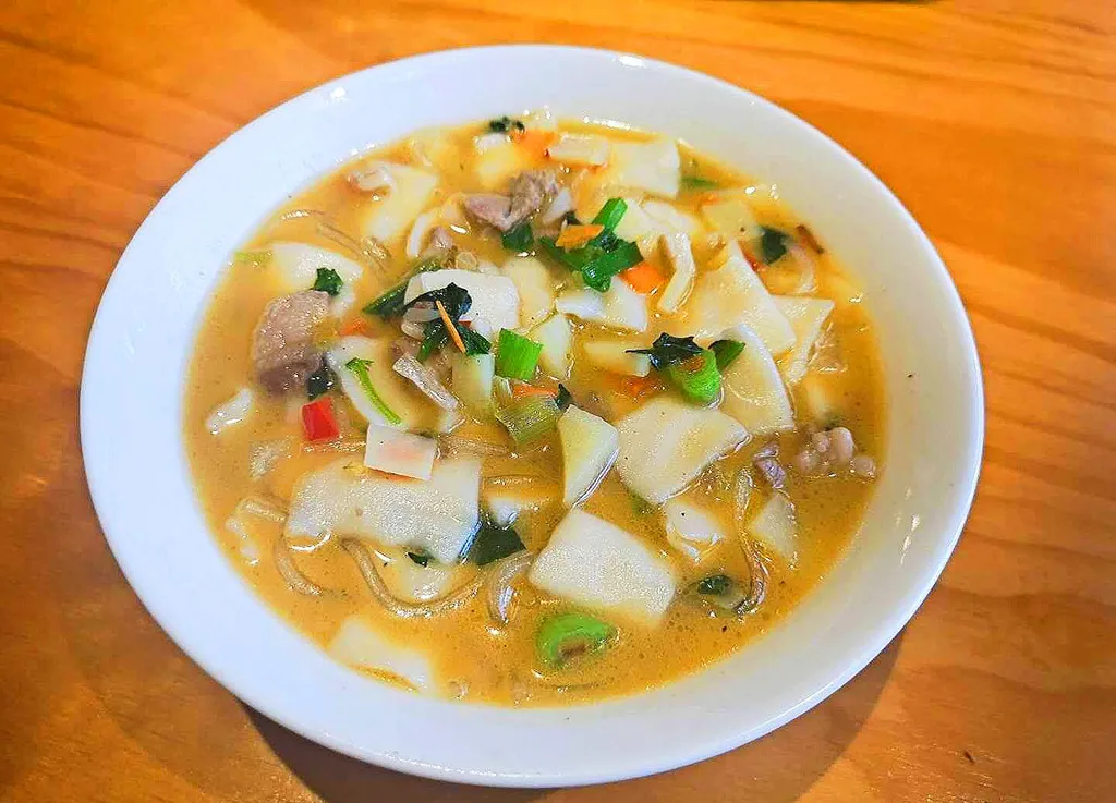 之所以提到这个,是因为乌冬与敦煌人爱吃的汤饼(本地人称为汤面片)算是同源美食。唐代欧阳修《归田录》中记载:“汤饼,唐人谓之不托,今俗谓之馎饦(bó tuō)矣。”馎饦传到日本之后被称为“唐果子”,是乌冬面的一种。