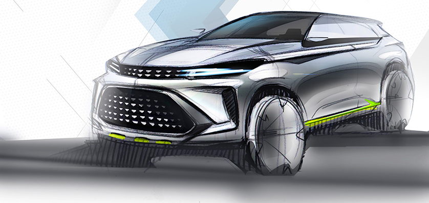外观方面,从设计草图来看,新车前脸采用鳞状的点阵式中网与两侧分体式头灯融为一体化的布局,底部的大嘴式格栅设计灵感源于中国古代建筑“翼角”,展现的十分精致动感。