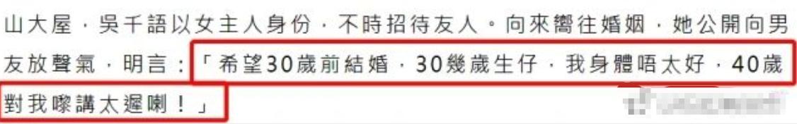 吴千语被曝曾数次以女主人的身份在家招待好友,并向施伯雄放话称自己想在30岁之前结婚,三十几岁生小孩,"我身体不太好,40岁对我来说太迟啦!"被指是在明晃晃地向男友催婚。