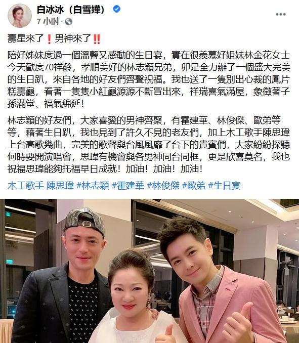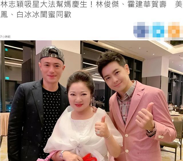 10月12日,根据台媒的最新消息,昨天过完七十大寿的林志颖妈妈的好闺蜜白冰冰在社交网站上晒出了最新生日派对的现场照,和闺蜜儿子林志颖还有林心如的老公霍建华合体晒照,并配文表示林志颖很孝顺为妈妈举办庆生派对,聚齐好兄弟,林俊杰、霍建华、欧弟等等全部出镜。
