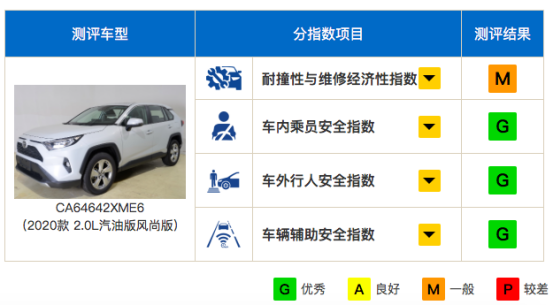 1月21日,中保研(C-IASI)公布了2020年参评车型的全部测试结果。其中,一汽丰田 RAV4荣放在车内乘员安全指数、车外行人安全指数以及车辆辅助安全指数项目上均获得了G(优秀)级评价,整体表现在2020年参评车型中名列前茅。