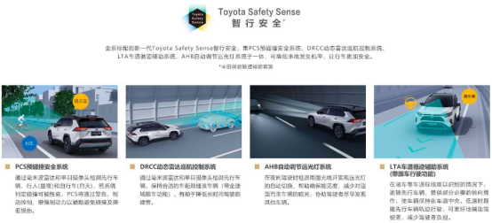 主动安全方面,RAV4荣放全系标配了Toyota Safety Sense智行安全系统。囊括了DRCC自适应巡航、PCS预碰撞系统、LTA车道循迹辅助系统、AHB远光灯自动调节系统四项主动安全科技,实现了“想用户所想、先用户一步”的安全保证。