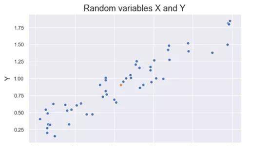 下图显示了随机变量X和Y的一些值。橙色点表示这些变量的平均值。这些值的变化与变量的平均值类似。因此,X和Y之间存在正值协方差。