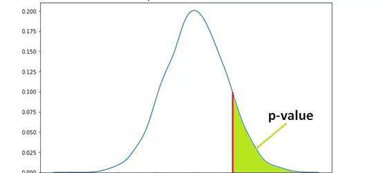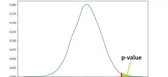 有另一个随机变量B,而且想看B是否大于A。从B中获得的平均样本均值为12.5。12.5的p值位于下图中的绿色区域。绿色区域表示获得12.5或更大极值的概率(在本例中高于12.5)。