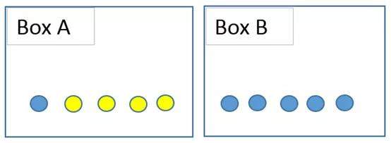 如下所示,假设有两个盒子,盒子里放着6个蓝色的球和4个黄色的球。我让你随便挑一个球。得到蓝球的概率是6/10=0,6。如果我让你从A盒中挑一个球结果会怎样?