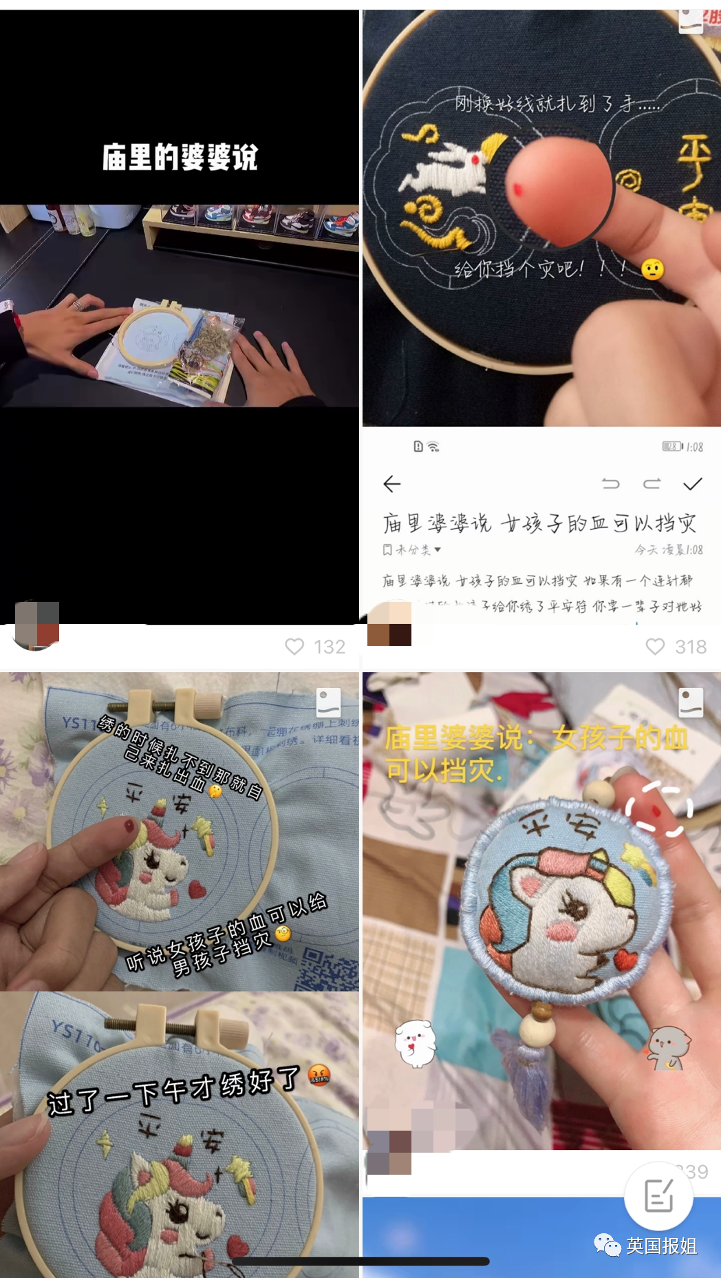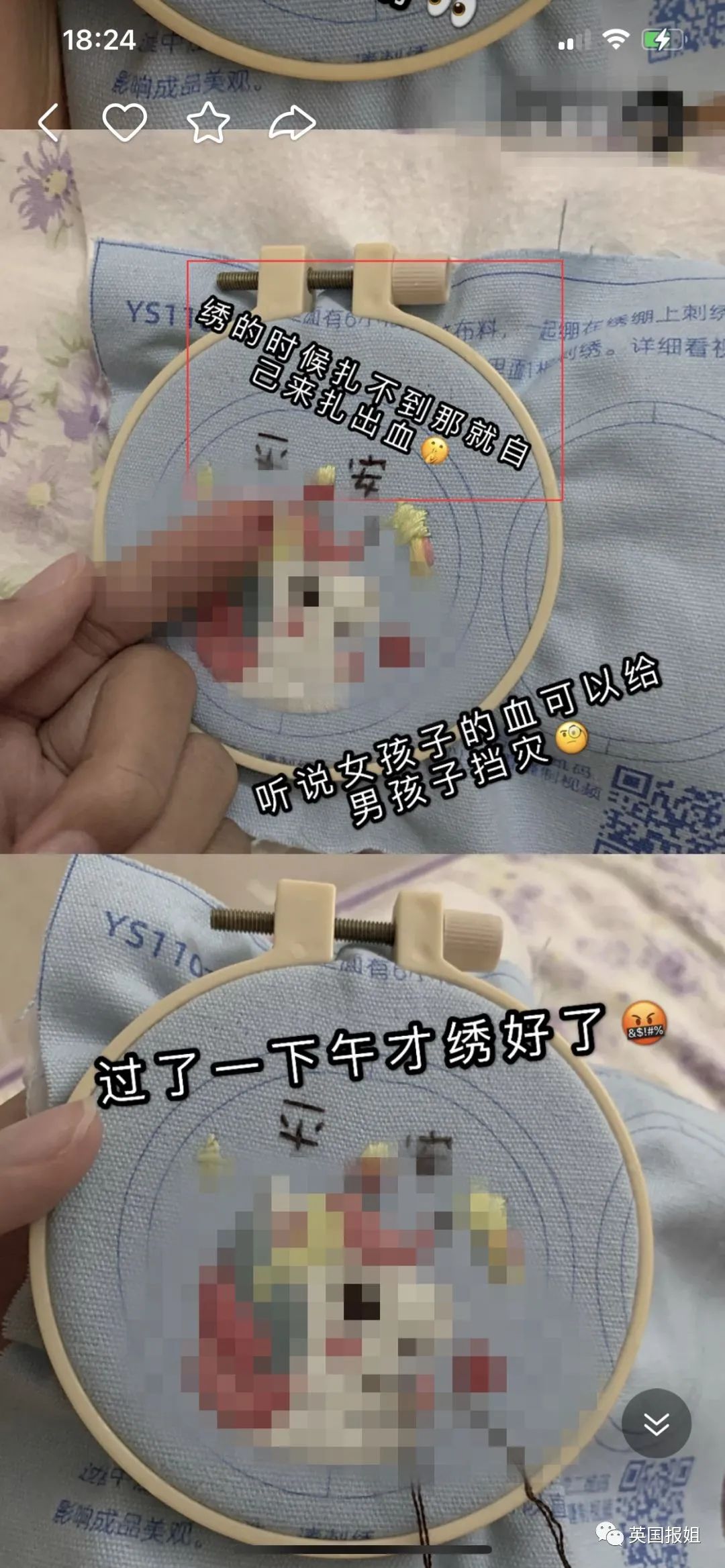 有些人开始在刺绣过程中故意扎破自己的手,来展示自己的“用心”。