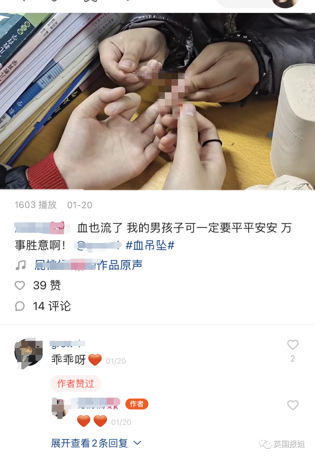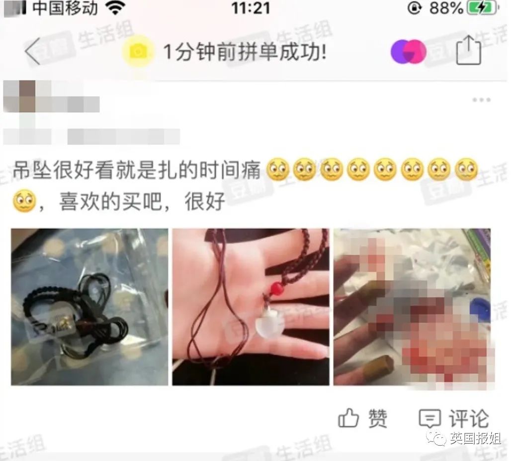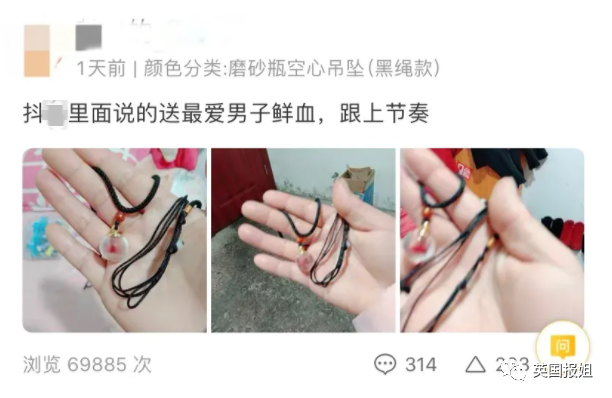 有人在刷短视频时,无意中看到了一个血吊坠,然后艾特了自己的女朋友……
