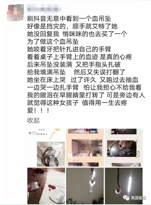 用自己的血给另一半做血吊坠,成了一种证明自己的方式,将这种“切肤之礼”当做爱情的最高象征。