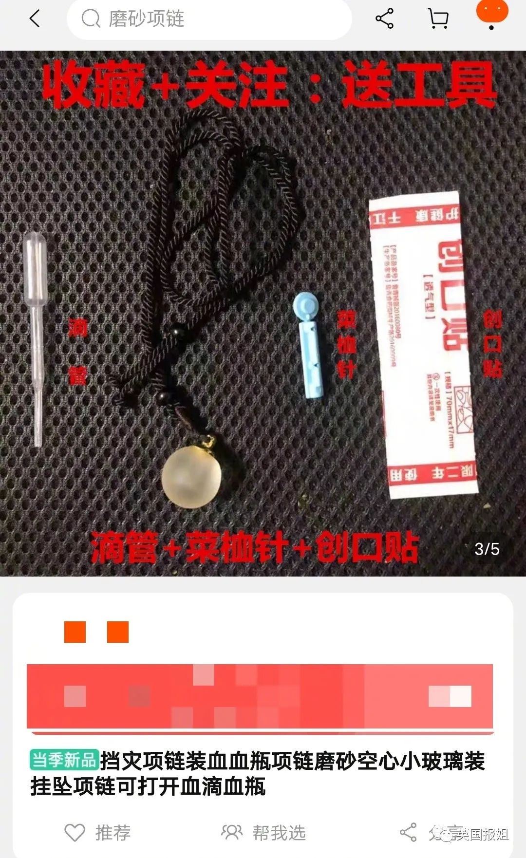 别看这吊坠只要20多块,商家还会“贴心”地送上针头、吸血管和创可贴三件套,这些采血工具已经不能用简陋来形容,连评论里买家都吐槽附赠的创可贴都没有黏性……