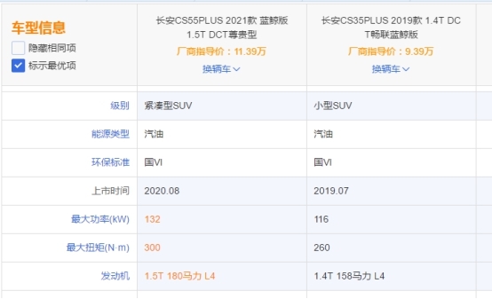 这次全新CS35PLUS没用上CS55PLUS的1.5T蓝鲸发动机,其实我觉得现款动力是够的,毕竟35还是小型SUV,从推重比(马力/整车质量X 100%)上看,CS35PLUS蓝鲸版的动力并不比CS55PLUS蓝鲸版差。CS35PLUS蓝鲸版推重比:158/1380 %=11.45
