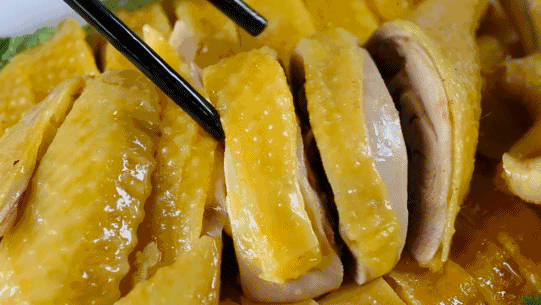 夹起一块肥嫩流油的鸡肉,蘸一下特制的酱油,入口只觉得皮脆肉嫩,汁香味浓,“真正做得好的白斩鸡都是有咬劲的,肉里厢纤维长,但不会塞牙缝。一口吃下去,香味道好像在嘴巴里喷出来。”