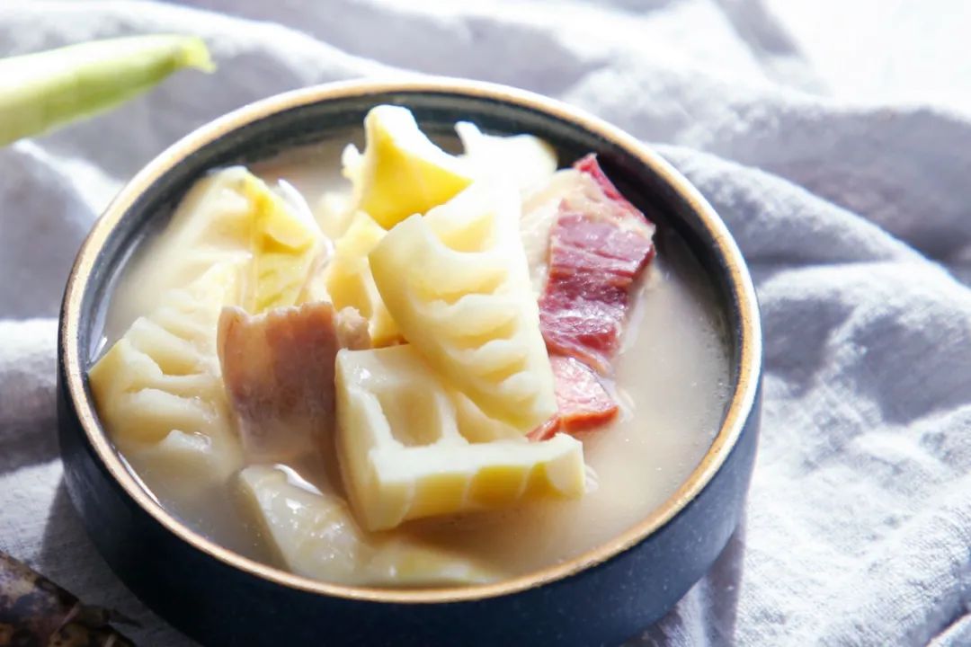 有人好用金华火腿替代咸肉,以为能更显档次。金华火腿味道必是不差的,可这腌笃鲜,火腿加来添些滋味尚可,咸肉,不能少的。有咸肉笃出的汤,才最合冬笋鲜甜,光用火腿,那算什么。