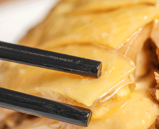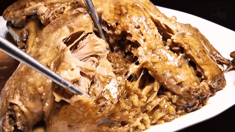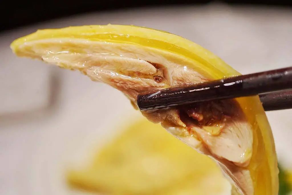 因为这只鸡在沸水烫熟后,被迅速置入冷水激冻,冷热骤然间交战,反复多次,才能淬出这般脆嫩弹性。