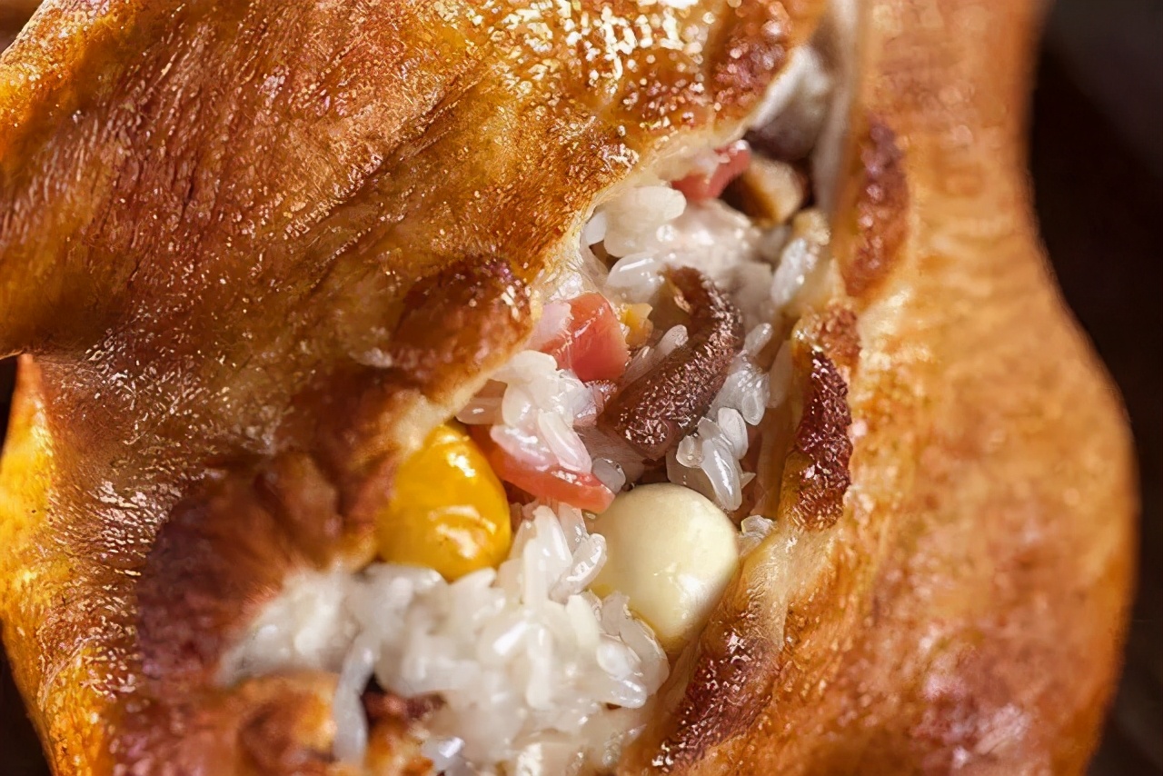 火腿、冬笋、干贝、水发香菇均切成丁,栗子去壳,取肉切丁,鸡肫、鸡肉分别洗净,均切丁,糯米淘洗干净,加水蒸熟。烧热炒锅放入猪油,将葱姜下锅略煸一下,烹入料酒,投入配料,加入酱油、白糖,烧上味,再放入糯米饭拌匀,填入鸭腹内。
