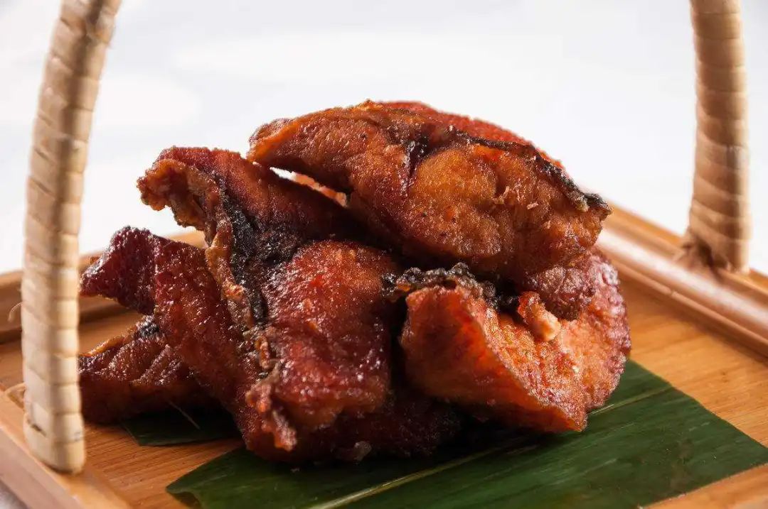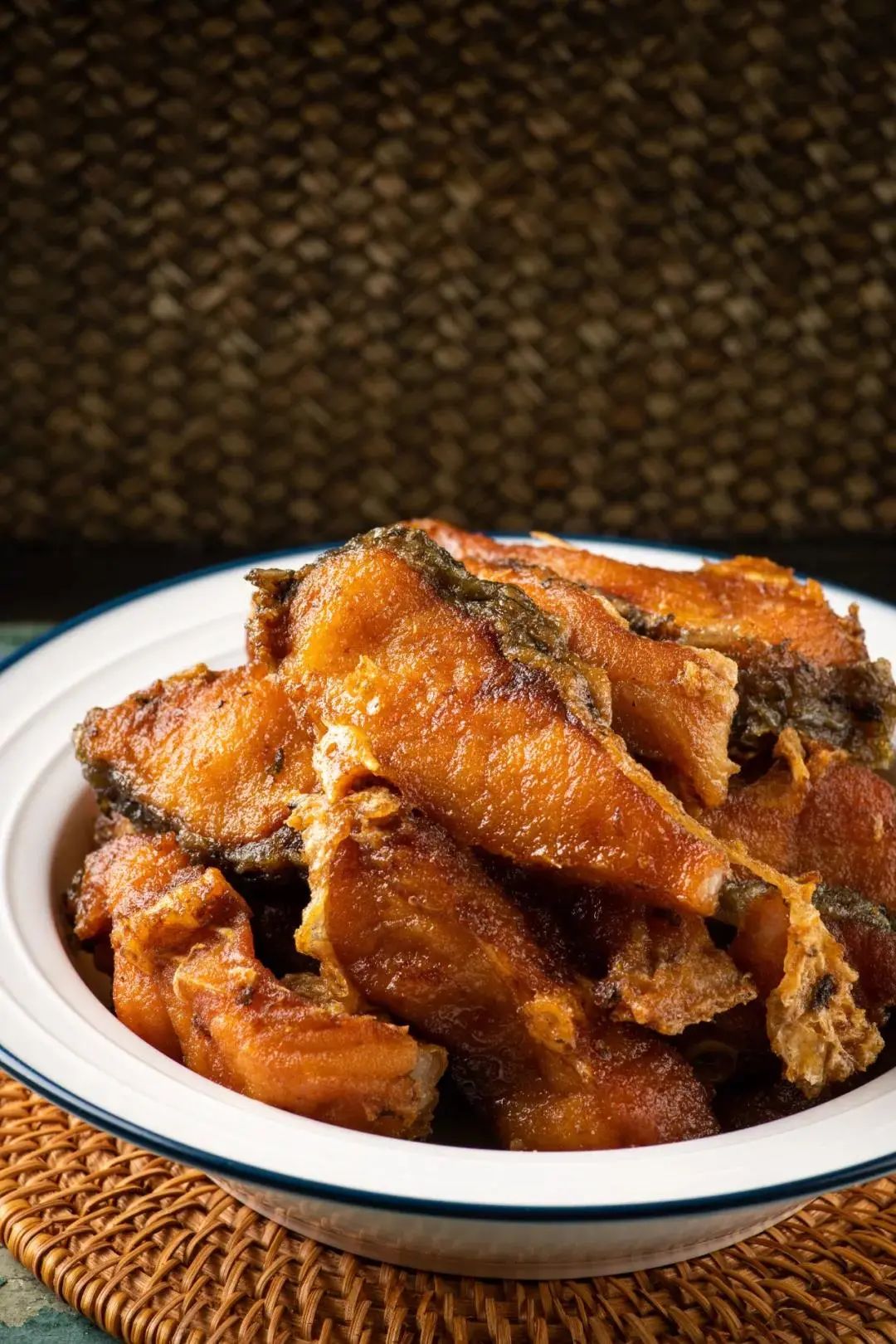 熏鱼,连皮带骨为上品。要骨酥肉嫩,是技术活。腌渍好的鱼片(说是片,更像是鱼块),风干后下锅,不需长,一刻钟左右,足够鱼肉稍稍收紧。入油汆,鱼灿黄泛红,连着骨都酥了。