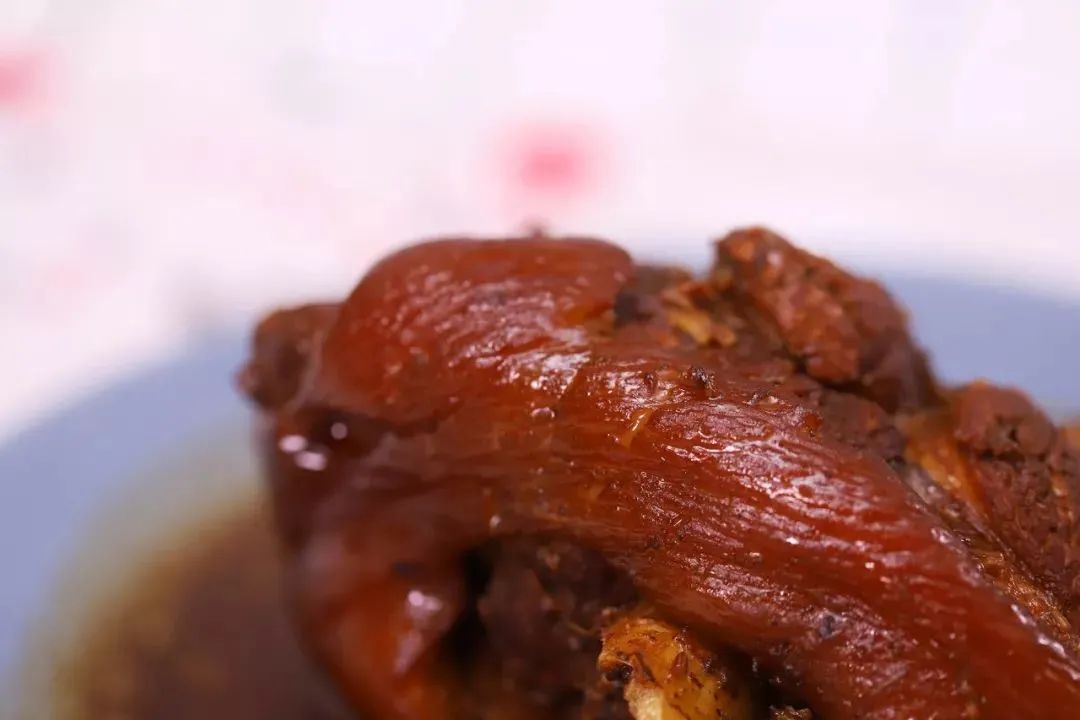 大火烧至猪蹄上色,改小火炖烂,火候足时自然美,收汁浓稠,蹄髈色泽红亮,停火,便大功告成。